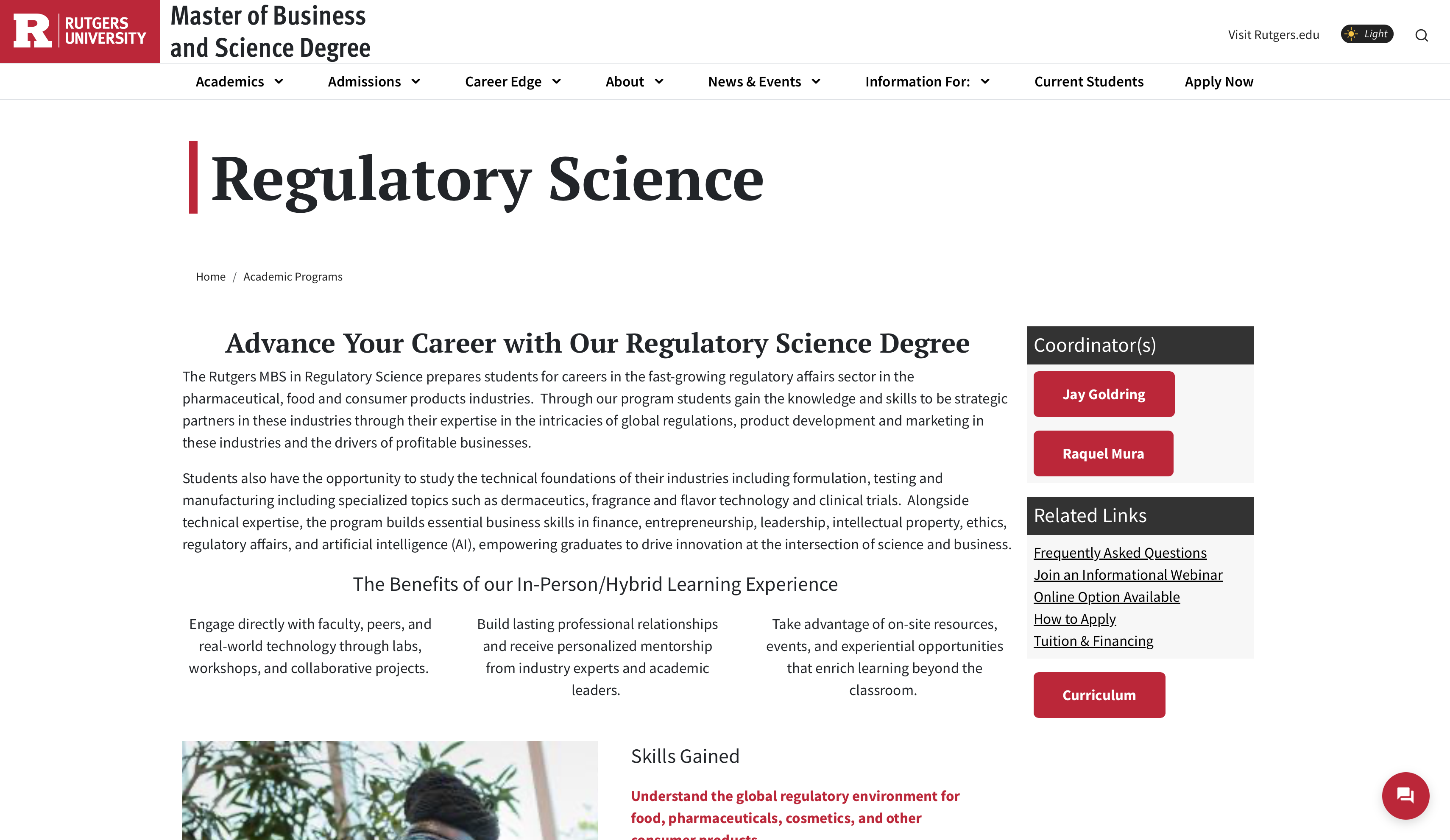The Rutgers MBS in Regulatory Science prepares students for careers in the fast-growing regulatory affairs sector in the pharmaceutical, food and consumer products industries. Through our program students gain the knowledge and skills to be strategic partners in these industries through their expertise in the intricacies of global regulations, product development and marketing in these industries and the drivers of profitable businesses. Speak with your advisors if you have any questions or concerns.